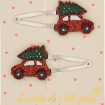 En route pour Noël avec ces voitures glitter et leur sapin sur le toit ! Un duo de barrettes plein de magie pour rouler vers les fêtes avec style.