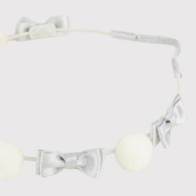 Couronne ornée de petits nœuds argentés et de pompons blancs.