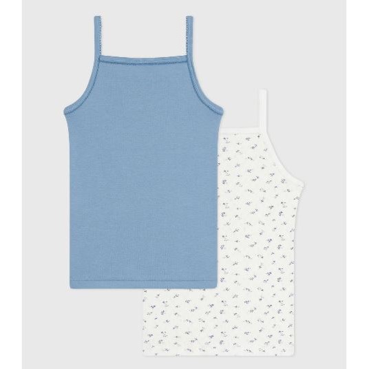 Ce lot comprend un débardeur à fines bretelles en côte 1x1 unie, un débardeur en coton ajouré imprimé fleurs.