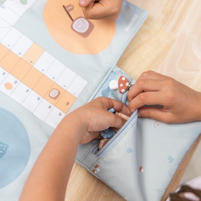 La plateau en tissu se plie facilement pour tenir dans la pochette qui la contient. Il comprend également une poche zippée pour ranger les magnifiques chips avec la tête d'ours colorés et le dé inclus.